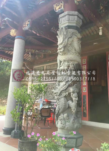 青石龍柱自清代以后大量出現,因青石“韌”,宜精雕細刻。若按鏤雕深淺計算,具體可分為蟠龍柱、人物柱、花幕柱、八仙柱等;龍柱則又有淺浮雕與高浮雕之別,“白龍”柱基本是淺浮雕,而“青龍”基本是透析度極高的高浮雕。在龍的數量上區分,有單龍的盤繞柱,雙龍戲珠的柱子。而最為別致的是,“福龍”系列中聚成了閩南石雕龍柱的靈魂、寄托閩南人民的希望的“翻天覆地龍柱”。此外,可以按石柱本身的形狀分為方柱、八棱柱、六棱柱等等。
