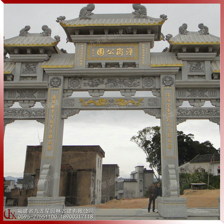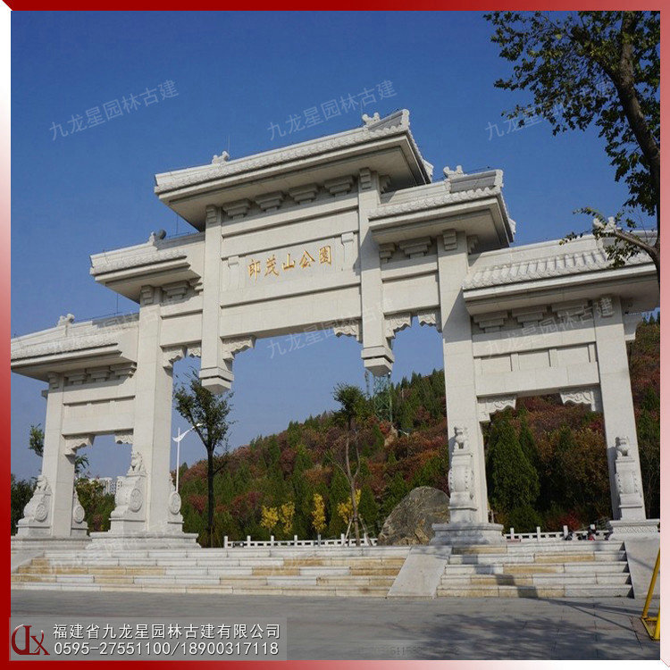 石牌坊是用石材修建的一種建筑類型,不僅結構自成一格,別具風采,而且集雕刻、繪畫、匾聯文辭和書法等多種藝術于一身,熔古人的社會生活理念、封建禮教、封建傳統道德觀念、古代的民風民俗于一爐,具有瑰麗的藝術魅力、很高的審美價值和豐富而深刻的歷史文化內涵。三門石牌坊就是建有三個門的石雕牌坊樣式,適用于寺廟景區、園林廣場、別墅小區、村莊路口等裝飾擺設。