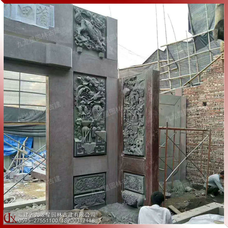 石雕浮雕壁畫(huà)在潮汕祠堂中占了重要的地位。宗祠門(mén)面浮雕在內(nèi)容、形式和材質(zhì)上與圓雕一樣豐富多彩。下圖是九龍星園林古建案例-潮汕祠堂門(mén)面獅象浮雕圖 浮40公分。