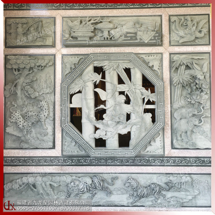 石雕浮雕壁畫在古建筑外墻中占據重要的地位。古建筑的石雕浮雕在內容、形式和材質上與圓雕一樣豐富多彩。建筑石雕浮雕常見的材料有青石、花崗巖、白麻、芝麻黑、羅源青、古田青等等。浮雕的雕刻技藝和表現體裁與圓雕基本相同。